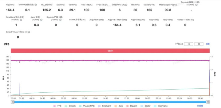 半小时烽火地带平均164.4帧,功耗4.3W。